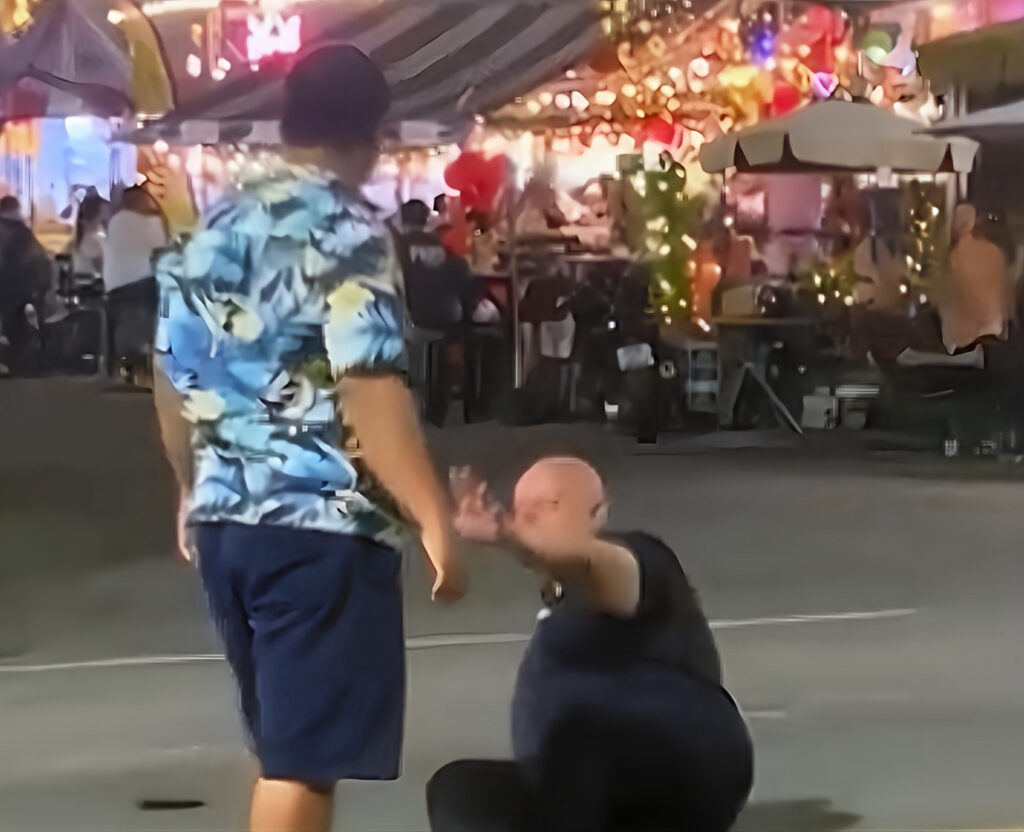 PATTAYA/JOMTIEN: Op sociale media circuleert een kort FILMPJE waarin te zien is hoe een man een buitenlandse toerist van achteren schopt en die vervolgens op straat valt. Het 38 seconden durende beeldmateriaal, naar verluidt ongeveer twee weken oud, zou zijn gemaakt bij de avondmarkt aan Jomtien Beach Road.