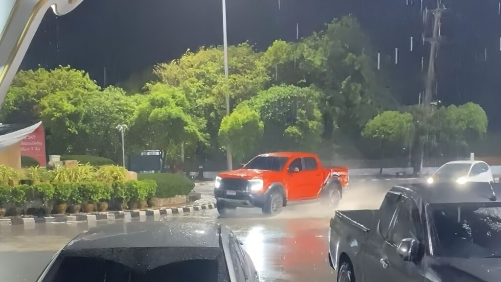 BANG SAEN: Een IJslandse man is gisteren in de problemen gekomen toen hij met een feloranje Ford Raptor aan het driften was bij de rotonde van Bang Saen, terwijl de regen met bakken uit de lucht viel. Zijn roekeloze rijstijl trok al snel de aandacht, en binnen de kortste keren gingen video’s van zijn stuntelige capriolen viraal op sociale media.