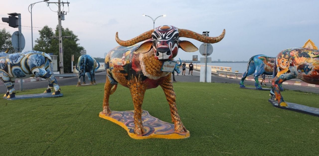 In de beelden zien we drie meisjes en een jongen die zich als professionele dansers gedragen, terwijl een andere tiener de show filmt. De buffelstandbeelden, gemaakt door studenten voor het Buffelracefestival van Chonburi, dienen blijkbaar niet alleen als decoratie, maar ook als dansvloer voor de nieuwste hit.