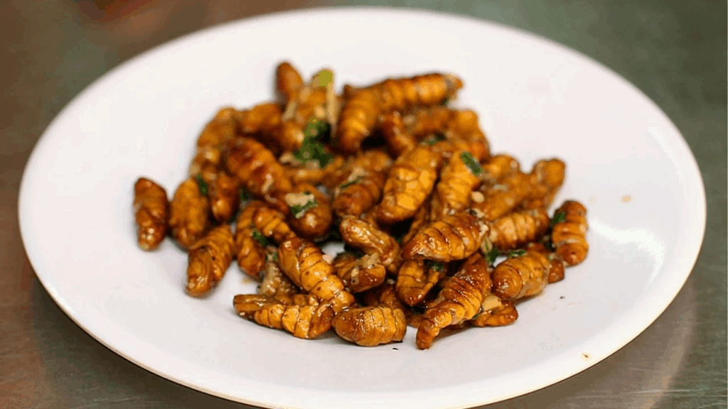 Knapperige, eiwitrijke zijderupsen gefrituurd met kruiden; ongebruikelijke textuur en licht bittere smaak voor beginners.