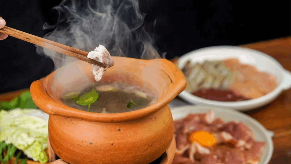 Hartig, langzaam gestoofd varkensvlees met rijst, ingemaakte groenten en gekookte eieren; de rijke smaak kan voor sommige gasten te zwaar zijn.