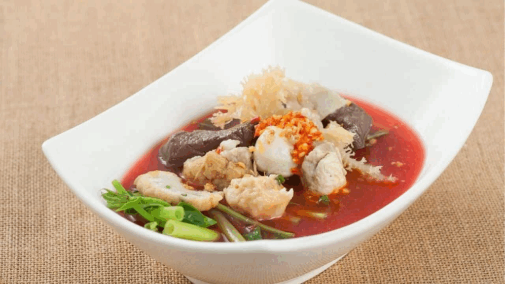 Levendige roze noedelsoep met visballetjes, tofu en ochtendglorie; visueel opvallend met gefermenteerde smaak.