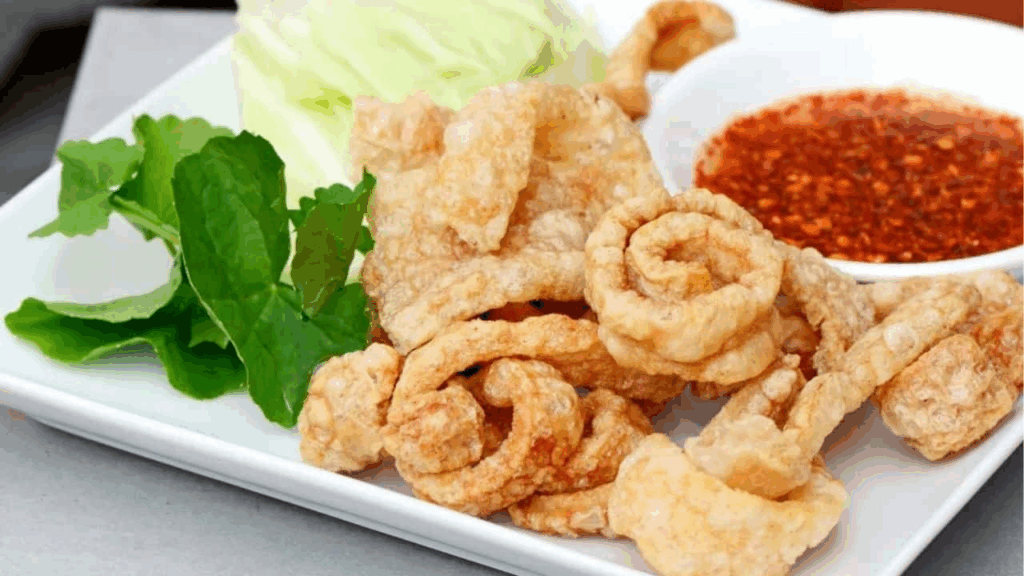 Knapperige snack van varkenshuid; hartig, maar kan voor sommige bezoekers droog of vet zijn.