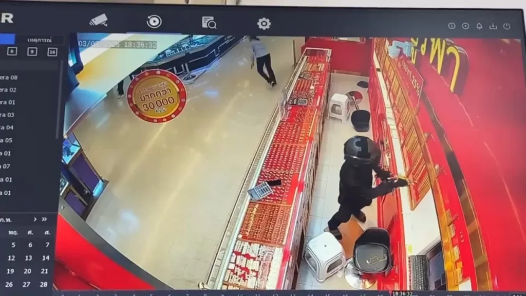 ISAAN: In Ubon Ratchathani is een 15-jarige jongen aangehouden in verband met een brutale goudroof in een goudwinkel binnen een Lotus-supermarkt. Eergisteren klom de verdachte, geheel in het zwart en met een motorhelm, over de toonbank, sloeg met een hamer een glazen vitrine kapot en roofde sieraden ter waarde van meer dan 2,4 miljoen baht (bijna 65.000 euro) uit meerdere bakken.