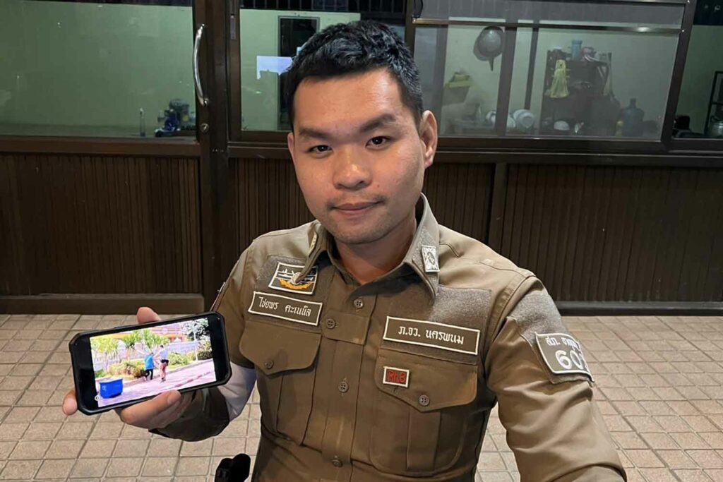 NAKHON PHANOM:-Een politieagent redde moedig een vrouw die door een zwerm bijen bij Wat Phra That Phanom werd aangevallen. Een in omloop zijnde video toont de vrouw die zich bukt terwijl ze wordt gestoken.