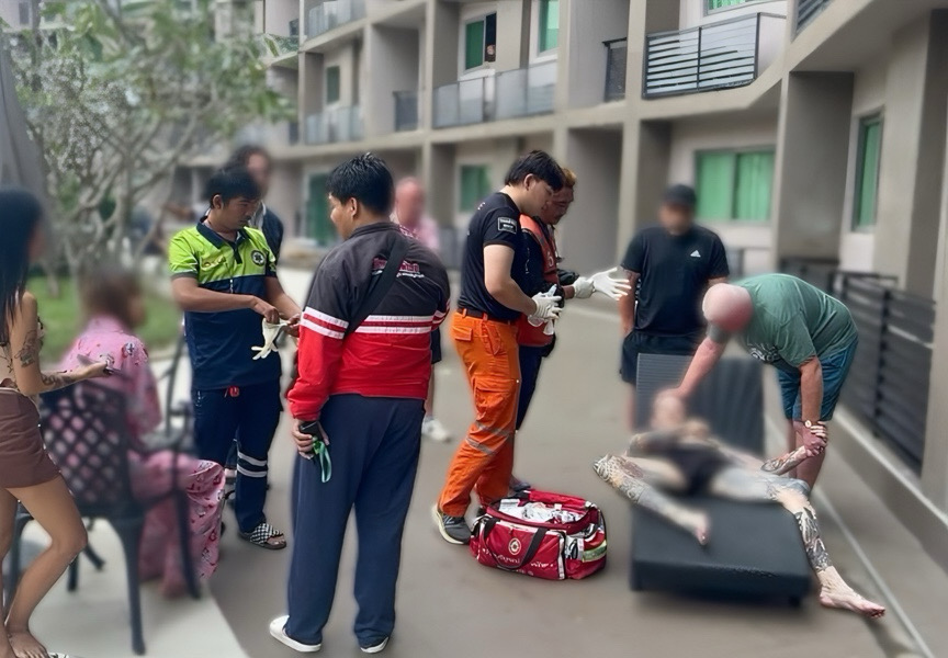 PATTAYA: Een 45-jarige Amerikaan maakte gisteren een noodsprong van de tweede verdieping van een flat aan Soi Thappraya 7 en liep flink letsel op. Hulpdiensten rukten uit en troffen hem met een lege blik, wartaal uitbrakend en verwondingen aan borst en been. Hij is ter plekke gestabiliseerd en naar het ziekenhuis afgevoerd.