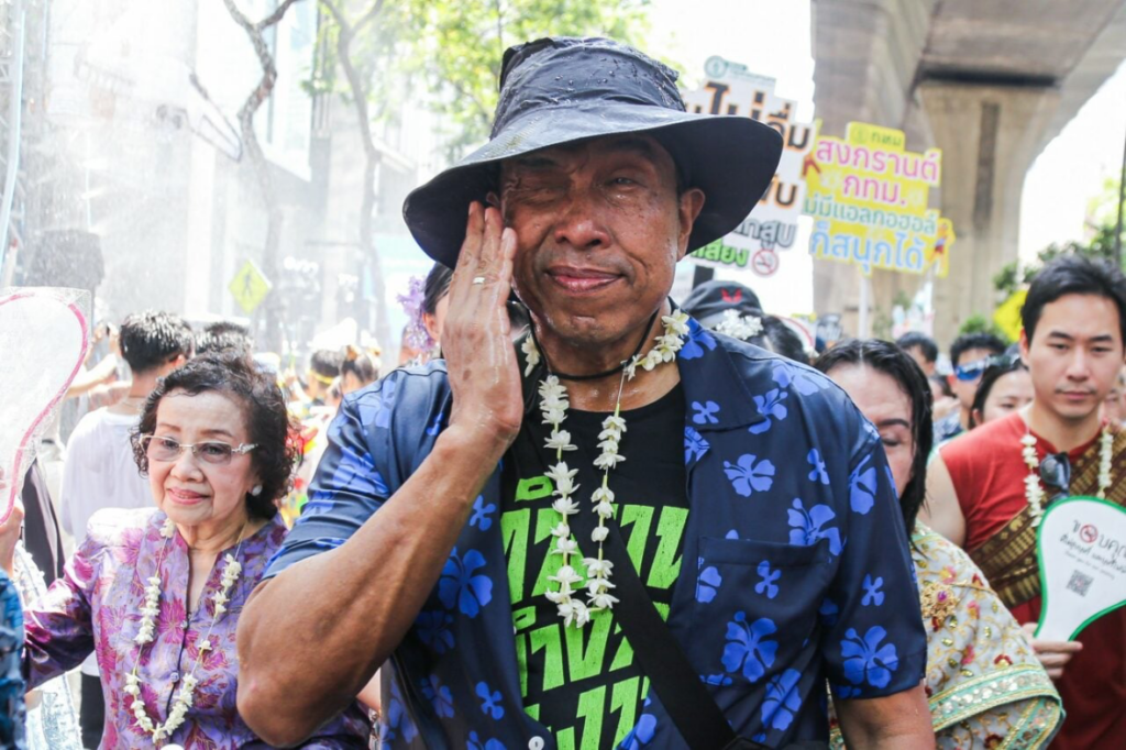 Voor Park Silom, op Thanon Silom in het district Suriyawong (Bang Rak), leidde de gouverneur van Bangkok, Chaichat Sittiphan, de traditionele Songkran-ceremonie op Silom met veel fanfare. Hij voerde een levendige processie aan, begeleid door zangers op tuk-tuks, in een zeer feestelijke “Shawl on Jeans”-sfeer.