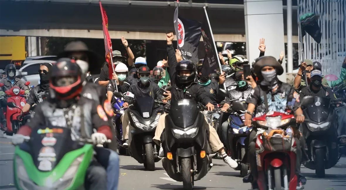 De demonstranten reden vanaf het CentralWord-winkelcentrum aan Rama I Road voordat ze om 12.00 uur mobiliseerden bij het ministeriegebouw aan de Vibhavadi Rangsit Road.
