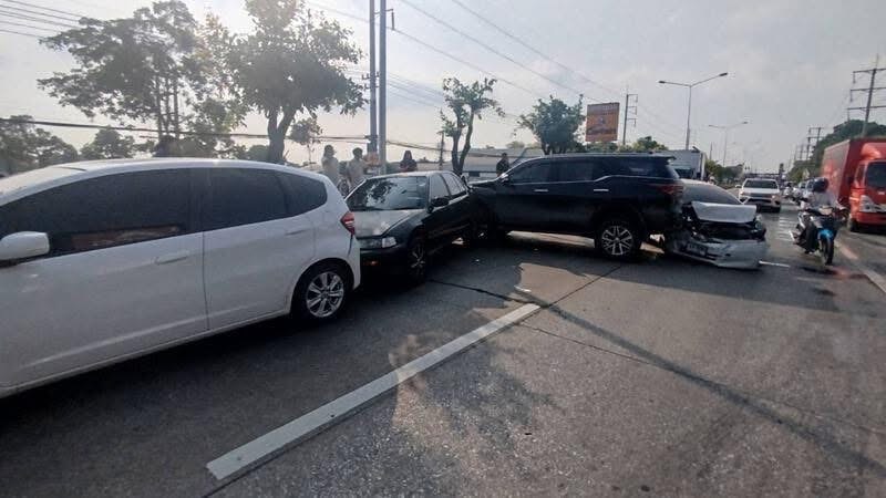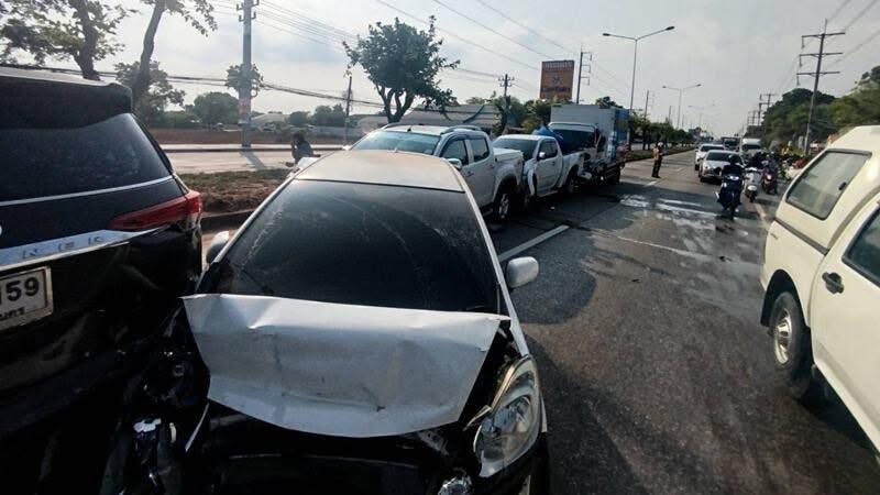 ISAAN: Gisteren tijdens de spits was het een drukte van belang toen zeven auto’s op de snelweg een flinke botsing veroorzaakten. Het voorval vond plaats op de Ratchasima–Chokchaiweg, vlakbij een winkelcentrum. De politie en hulpdiensten arriveerden snel nadat er gewonden waren gemeld.
