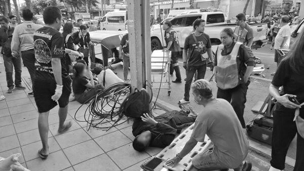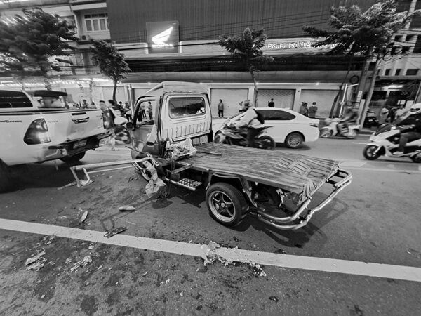 De politie van Rat Burana ontving een melding van een grote aanrijding bij Soi Pracha Uthit 21. Ze schoten meteen in actie en belden hulpdiensten en vrijwilligers om te gaan kijken.