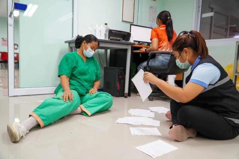 THAILAND:- Duizenden Thaise mensen gaven steun en deelde de foto’s van de @ PRD1KK Facebook-pagina van het Public Relations Department, waarop medische professionals en personeel van Nakhon Ratchasima’s Pak Chong Hospital op hun stoelen, aan hun bureau en zelfs op de vloer, in slaap vielen na vele uren achter elkaar in touw te zijn geweest.
