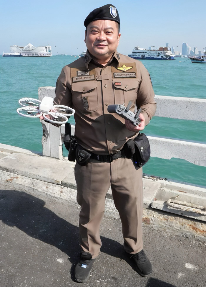 Een trotse kapitein van de immigratiedienst, Khun Apichat Jarurak, toonde zijn drone van het “Kruitvat” en vertelde dat niet alleen de pier, maar ook Pattaya Beach Road in de gaten werd gehouden.