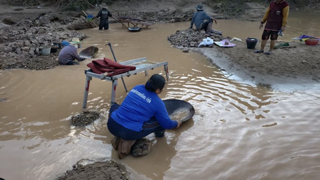 De mensen doen zand en grind in de pan en wassen het in de Mekong-rivier. Het goud, dat het zwaarste is, blijft op de bodem liggen. Ze spoelen het zand weg met water uit de rivier en vinden zo het goud. Soms vinden ze grotere stukjes goud. Daarna gebruiken ze kwik om het goud uit het zand te halen. Dit is een oude techniek die al heel lang wordt doorgegeven.
