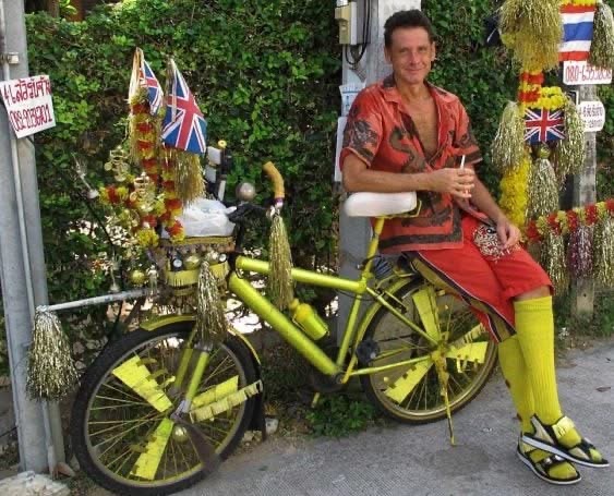 Hij reed langzaam op een felgekleurde, met bloemen versierde fiets, voorzien van glitters, veren en andere opvallende versieringen die in de zon opvielen. Zijn verschijning veranderde alledaagse straten in iets bijzonders. In goud en kleur gehuld, leek hij soms meer op een performance dan op een voorbijganger.