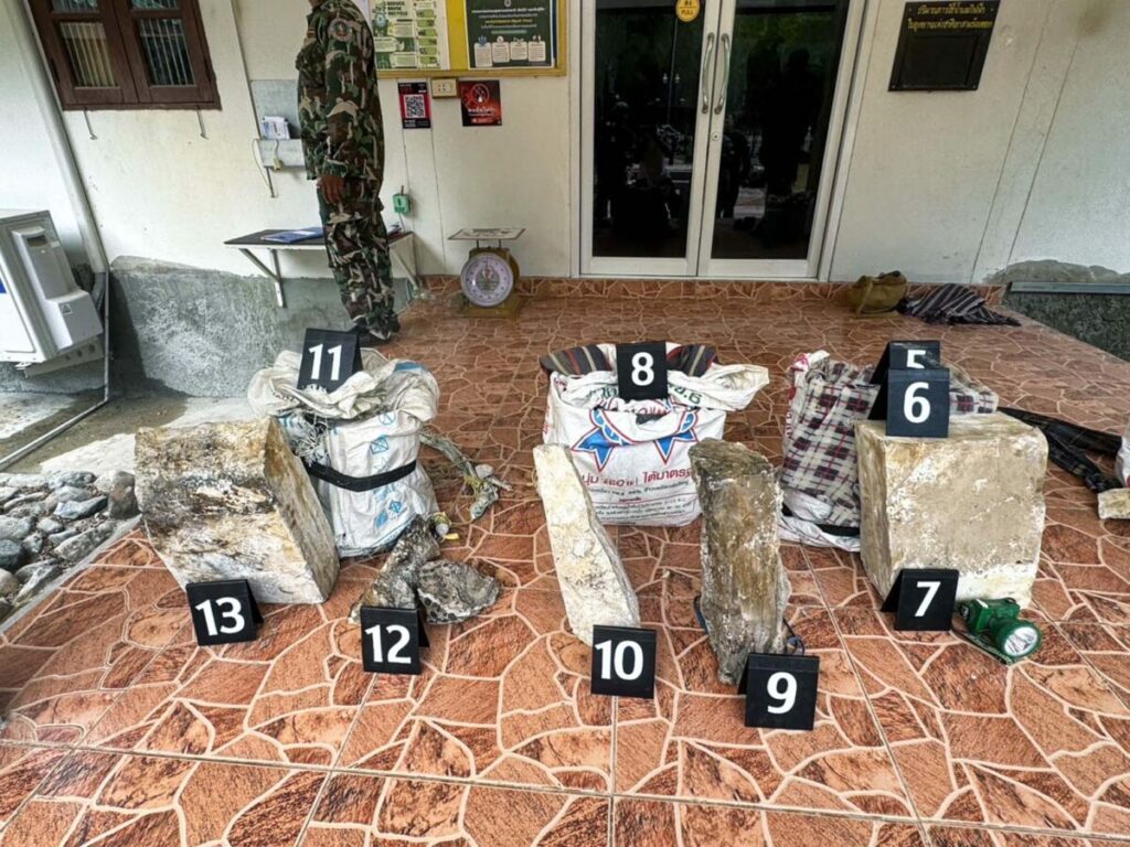 Tijdens de controle troffen de teams vier personen aan met aangepaste zakken, die ieder zware stenen bevatten. Drie verdachten wisten te ontkomen in het donker; één persoon, Khun Wicha, werd aangehouden. In beslag genomen materiaal omvatte vijf grote stenen met een gezamenlijk gewicht van circa 102,10 kg, aanvullend puin van circa 13,40 kg en twee hoofdlampen. Het aangetroffen bewijs is veiliggesteld.