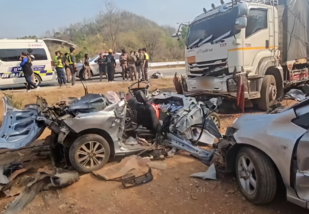 LAMPANG: Wat begon als een leuke weekend tripje veranderde afgelopen zaterdag in een tragedie op de Phahonyothinweg, tussen Tak en Lampang, bij de ingang van Mae Wa National Park. Een vrachtwagen, geladen met sanitair, kon niet op tijd remmen bij stilstaand verkeer door wegwerkzaamheden en reed in op een rij auto’s. Zeker negen voertuigen raakten beschadigd.