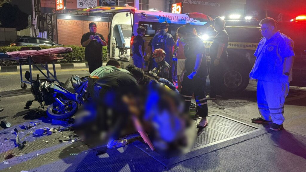 PATTAYA: Deze zondagmorgen heeft een ernstige aanrijding plaatsgevonden op de Pattaya Nua Road, waarbij een motorfiets met twee jonge kinderen achterop een stilstaande sedan ramde.