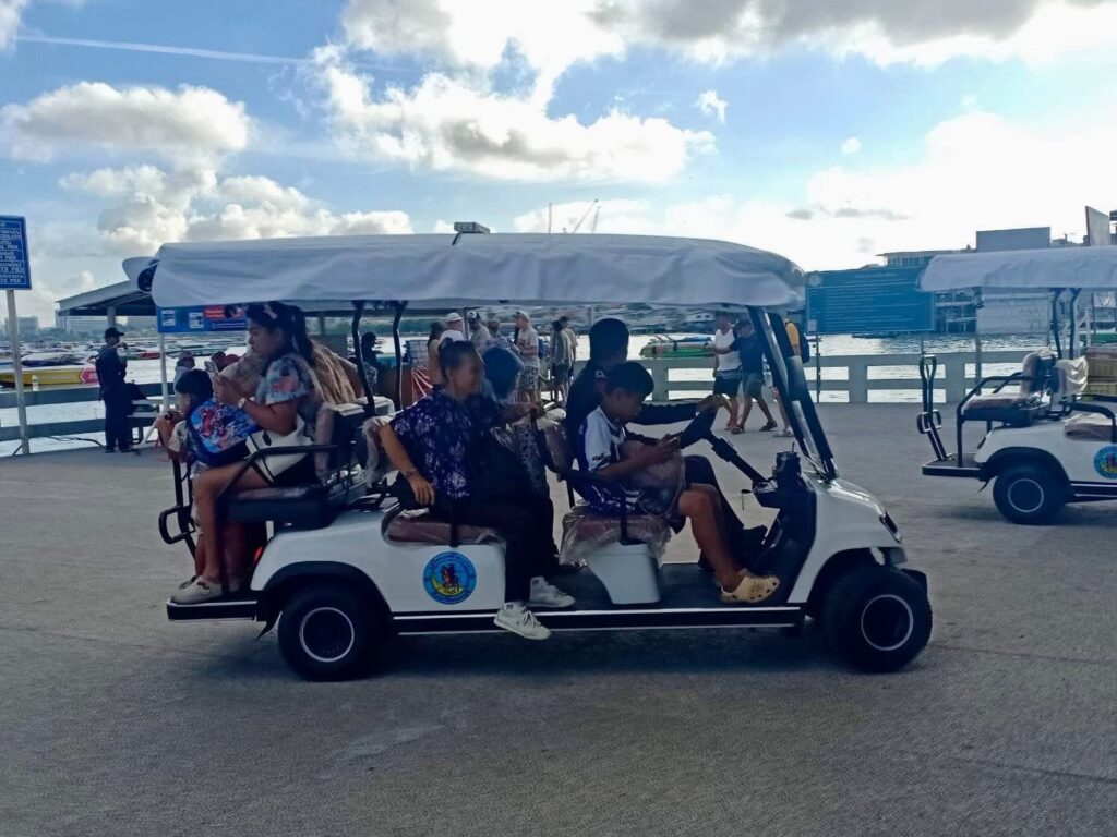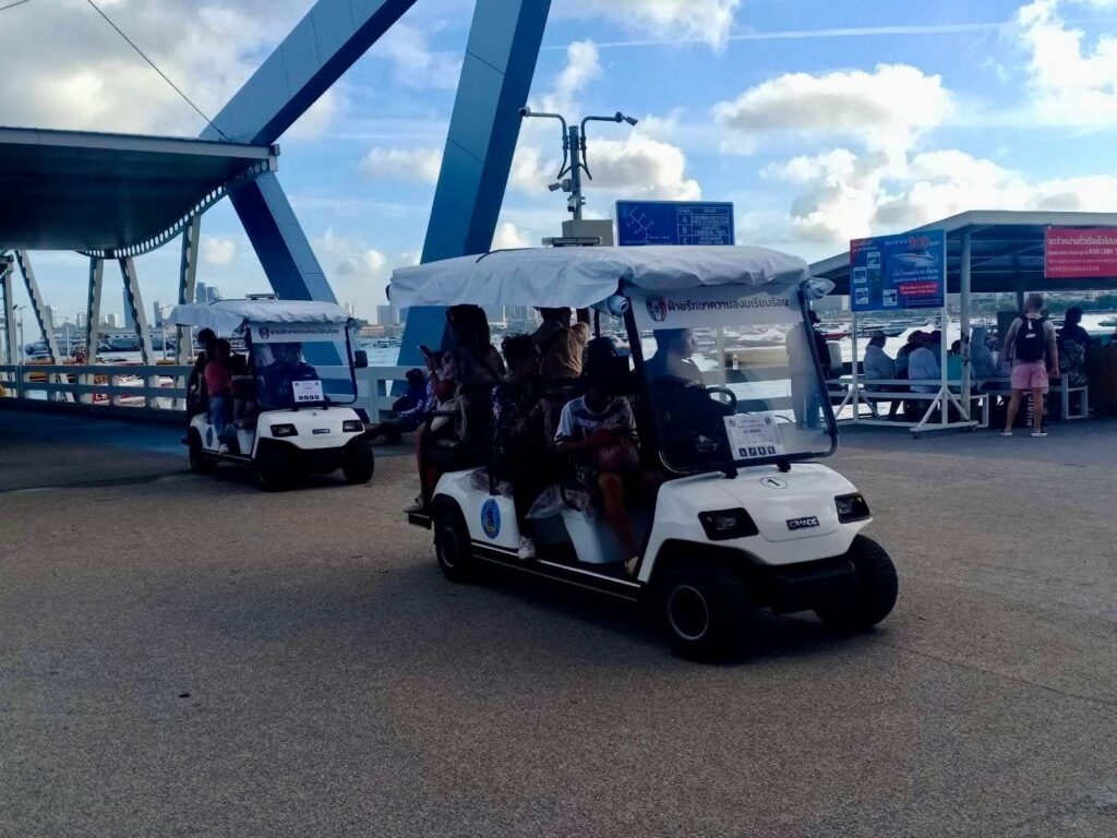 PATTAYA: “Gemak dient de mens” is het motto dat Pattaya letterlijk toepast: de stad zet gratis golfkarretjes in om toeristen naar de pier te vervoeren voor de overtocht naar Koh Larn.