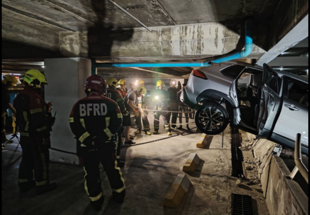 BANGKOK: Deze week is een auto door de wand van een parkeergarage op de derde verdieping aan de Rama IV-weg gereden, waarbij een val van het gebouw werd voorkomen. De 55-jarige bestuurster, Khun Taweep Songwannanamasakul, liep lichte verwondingen op. De auto stopte net na het doorbreken van de muur, waardoor een val naar beneden werd voorkomen.