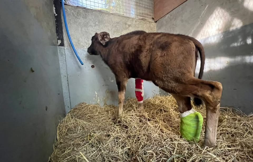 NAKHON RATCHASIMA: Een jong gaurkalfje maakt goede voortgang nadat het op 4 december 2025 werd gevonden met een draadlus om één poot. Wat aanvankelijk levensbedreigend leek, verbetert dankzij snelle medische zorg: de wonden genezen goed en de ontsteking is grotendeels weg.