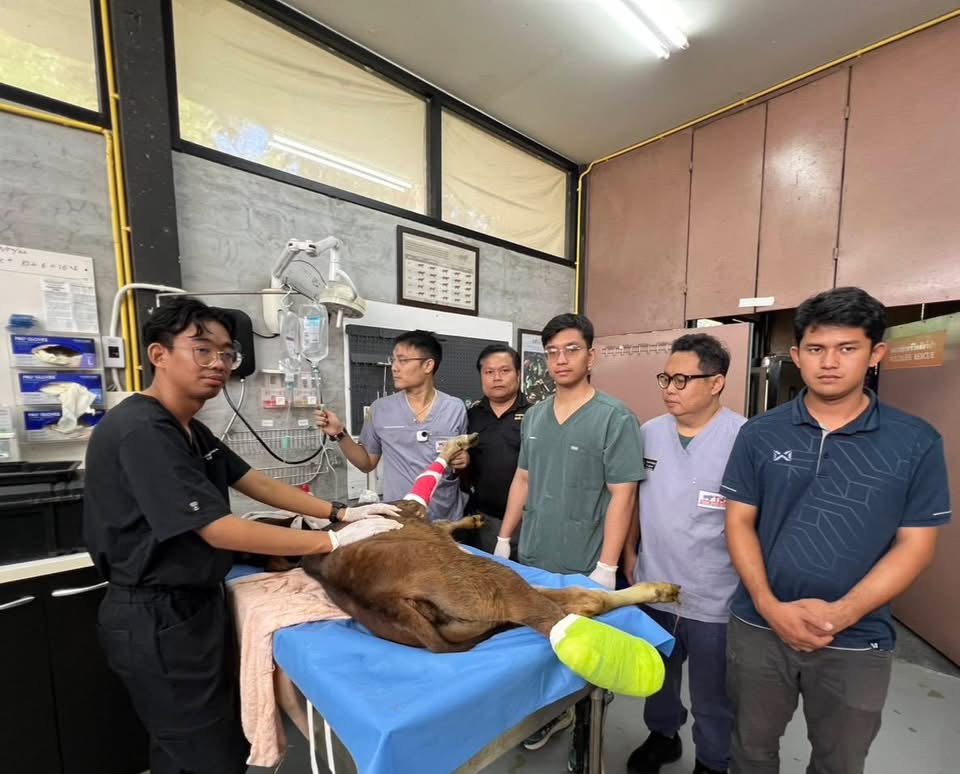 De redding en behandeling werden uitgevoerd in samenwerking tussen vier instellingen. Na een verzoek van Khao Yai National Park bracht een gespecialiseerd team het kalf over naar een kliniek in Pak Chong, waar een multidisciplinair team de zorg overnam. Onder narcose bleek nieuw weefsel te zijn gevormd; ook de achterpoot geneest stabiel. Er is een gipsverband aangebracht in aanloop naar een prothese.