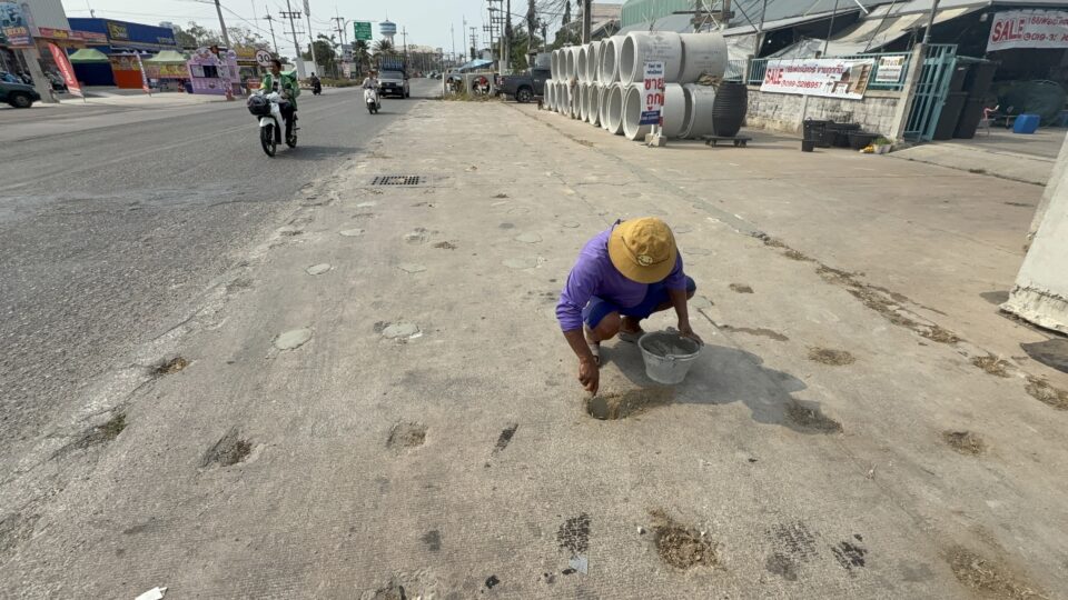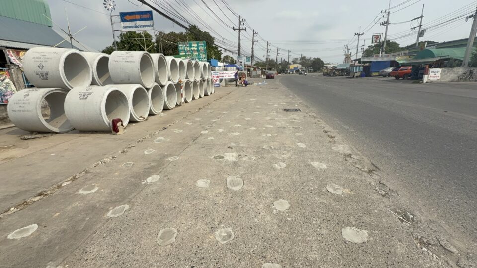 PATTAYA: De bewoners van het woongebied Eua Arthorn Na Khluea zeggen het zat te zijn: een aannemer heeft de weg over meer dan 300 meter gaten in het asfaltbeton geboord. De gaten liggen al jaren open en veroorzaken overlast, vooral bij regen wanneer het gebied onder water loopt.