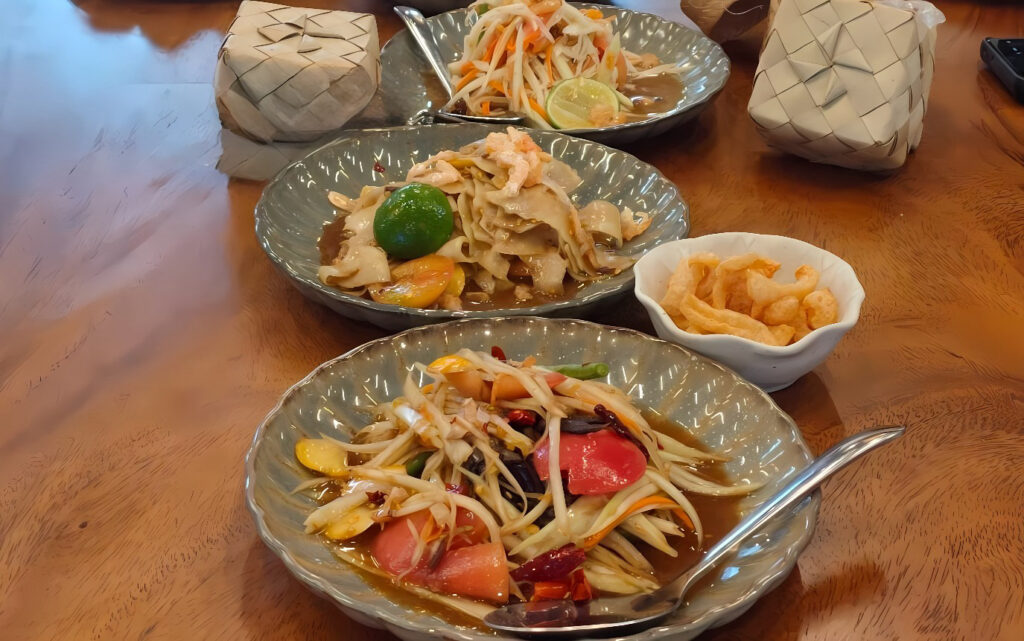 De absolute showstopper? De “Som Tum”, een verfrissende papajasalade die in verschillende heerlijke varianten wordt geserveerd. Van krab tot krokante meerval en zelfs exotische zeevruchten, elke versie biedt een unieke smaakervaring.