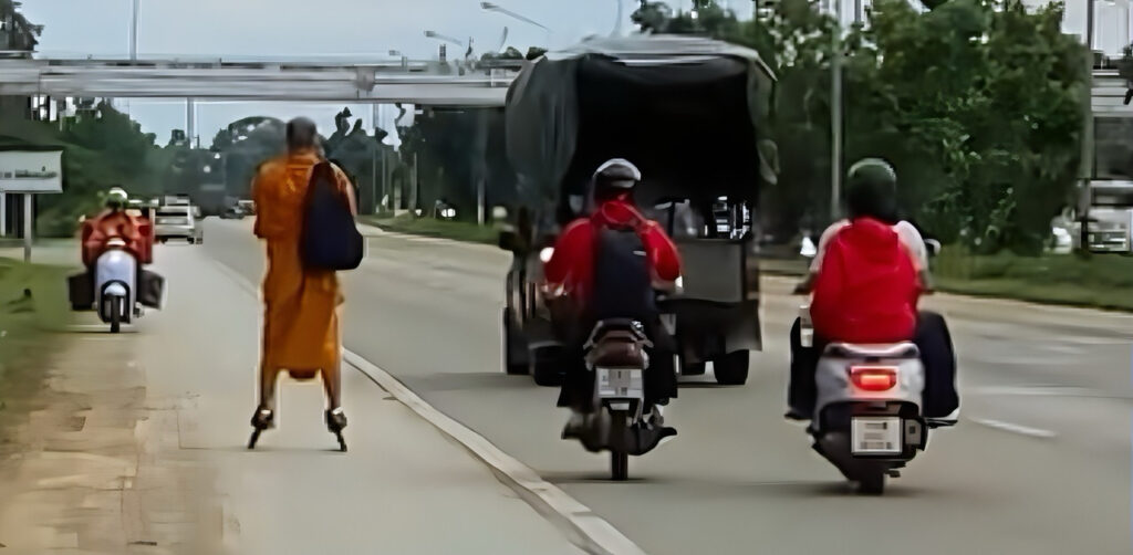 NOORD-THAILAND: Een Thaise monnik in Phitsanulok heeft de internetwereld in rep en roer gebracht door op skates langs een hoofdweg te zoeven. Ja, je leest het goed!