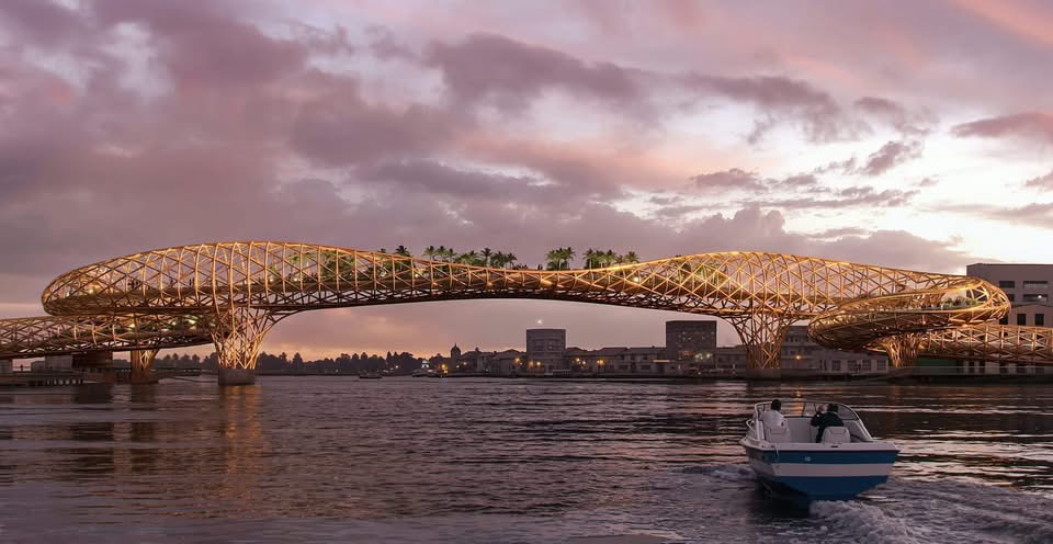 Het model laat een speels criss-cross patroon van metaal zien. Het idee is om de stad beter te verbinden voor voetgangers en een nieuw icoon toe te voegen naast de tempels en marktjes. Auto’s en veerboten krijgen gezelschap van wandelaars.