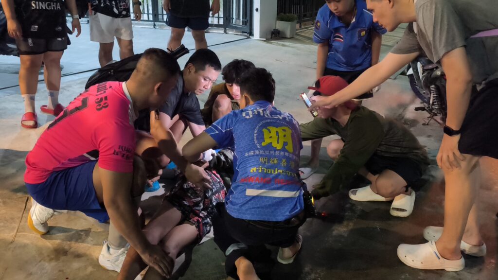 Reddingswerkers hielpen de gewonde man, die bloedde en gebroken tanden had. Ze werkten samen met ambulance 1669 van het Prachuap Khiri Khan Ziekenhuis om hem naar de spoedeisende hulp te brengen.
