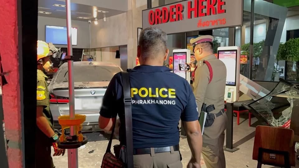 THAILAND: Afgelopen zaterdagavond vond er in Bangkok een ongewoon voorval plaats toen een BMW onverwachts door het glazen front van een KFC-restaurant reed. Het restaurant, gelegen in een Bangchak-tankstation op Sukhumvit 62, werd het middelpunt van een chaotische situatie.