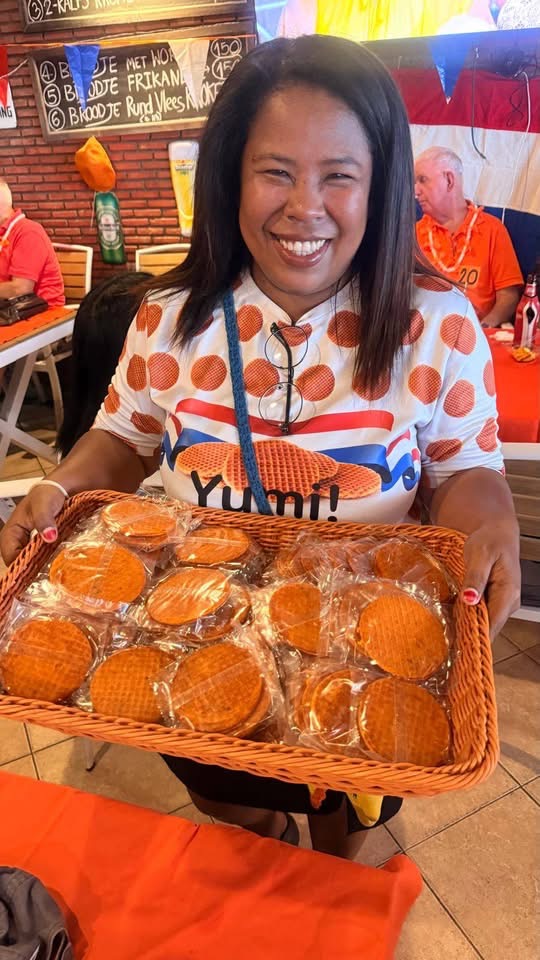 De gasten werden getrakteerd op een overheerlijk Koningsmaal, dat zoveel indruk maakte dat velen nog steeds aan het uitbuiken zijn. Terwijl Jeroen Tak genereus aan iedereen een Hollandse stroopwafel liet uitreiken.