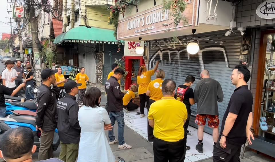 Gisteren kwam hij echter terug, vergezeld door de politie en toeristenpolitie, alsof het een verzoeningsdraaiboek was. Hij bood zijn excuses aan met een wai en begon met een kwast de deur zelf over te schilderen. De eigenaressen en het personeel hielpen vrolijk mee. Wat begon als een flinke blunder, veranderde plotseling in een gemeenschapsproject met een feelgood-factor.