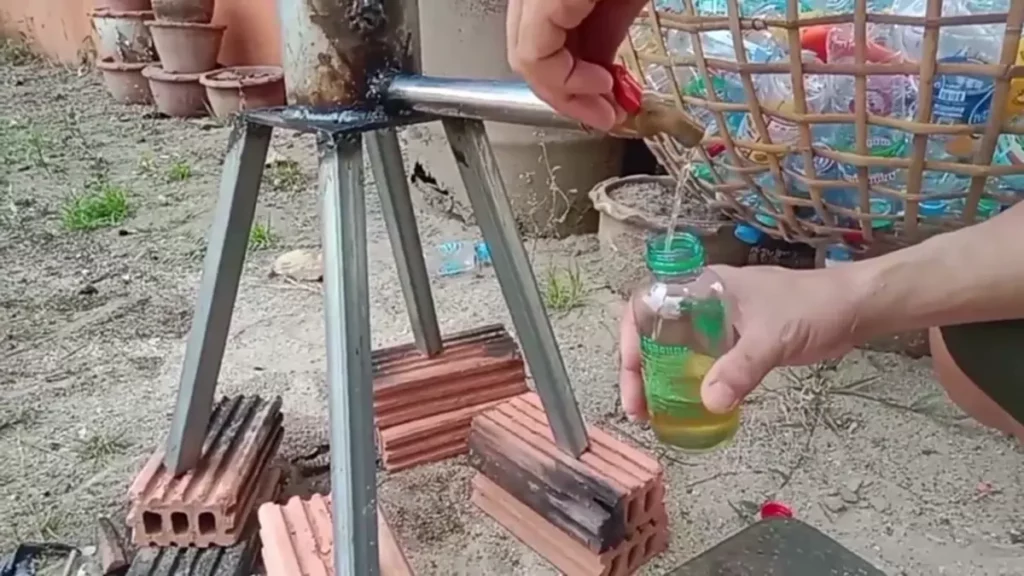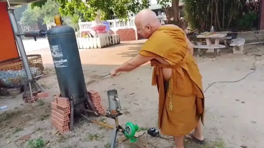 Phra Khru Vithan zag het op internet, sneed een oude gasfles open, monteerde er een stalen buis op en bouwde zo een simpele destillatie‑opstelling. Geen ingewikkelde machines, maar een praktische, robuuste constructie die doet wat ‘ie moet doen.