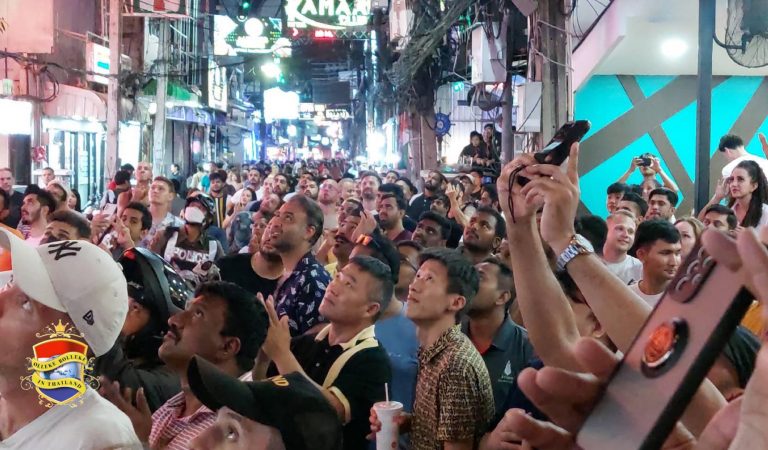 april 29, 2023 Doorgedraaide Thaise vrouw klimt op een hoog reclamebord in de Walking Street van Pattaya, toeristen kijken met ontzetting toe Lees verder...