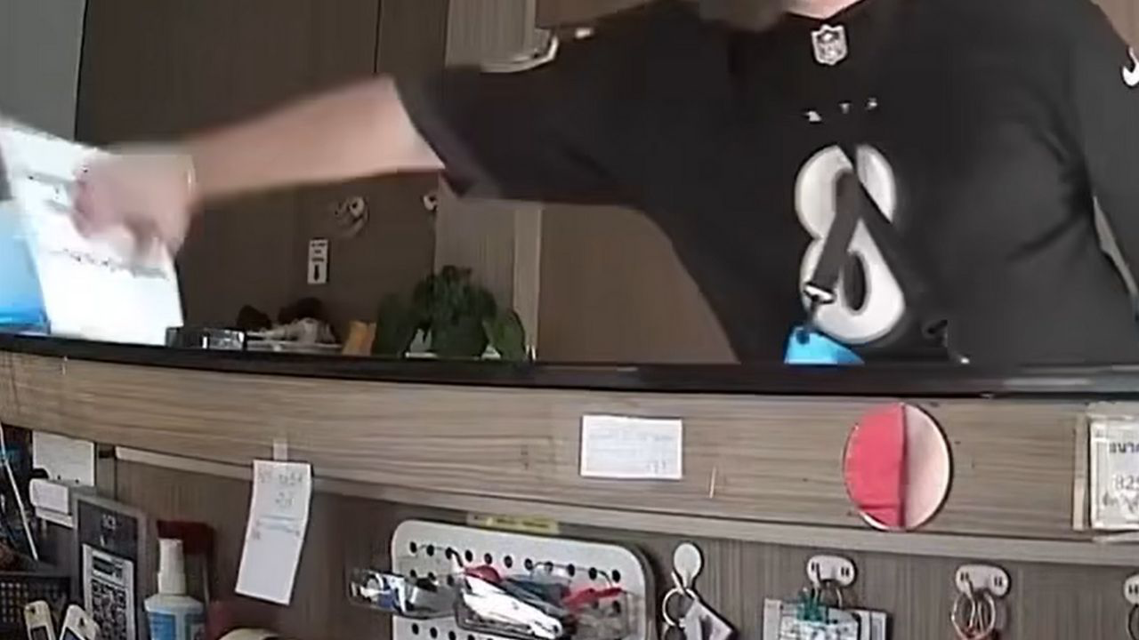 Fotos gedeeld op de Facebook-pagina van Phuket Times, laat de man zien die met een zwart T-shirt en een doos met eten in de hand behoorlijk boos wordt. Hij schreeuwde, sloeg op de balie en smeet spullen op de grond. Alsof dat nog niet genoeg was, deed hij alsof hij een pistool op het personeel richtte.
