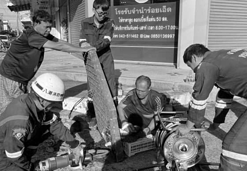 ISAAN: Gisteren kreeg het rampencentrum van Roi Et om half acht in de ochtend een melding: een kat zat klem in een afvoerputrooster voor de pandjeswinkel. Het team was er snel bij om de angstige kat te helpen.