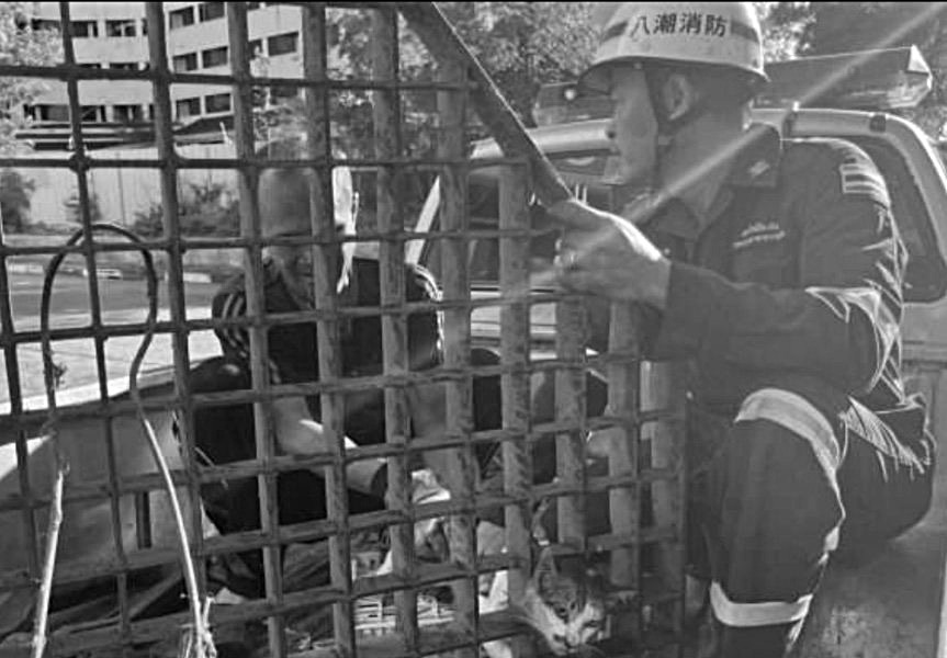 De zwart-witte kat had zijn kopje vast in een smalle opening van het rooster. Het team, onder leiding van Veerachai en Phumin, besloot het rooster met kat en al naar het rampencentrum te brengen, waar ze de juiste spullen hadden om te helpen.