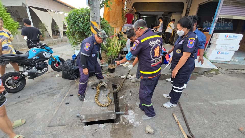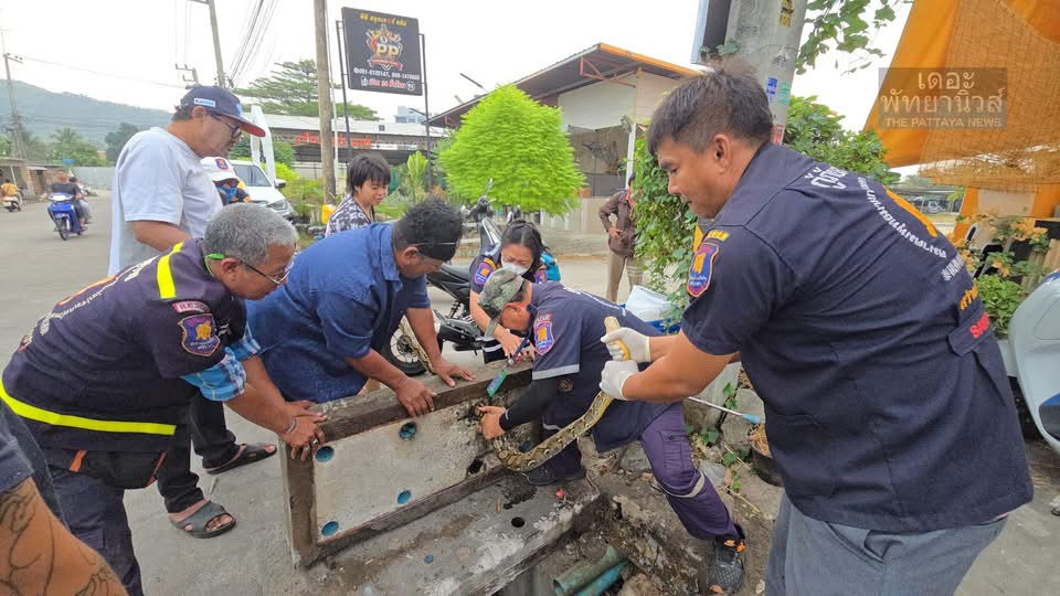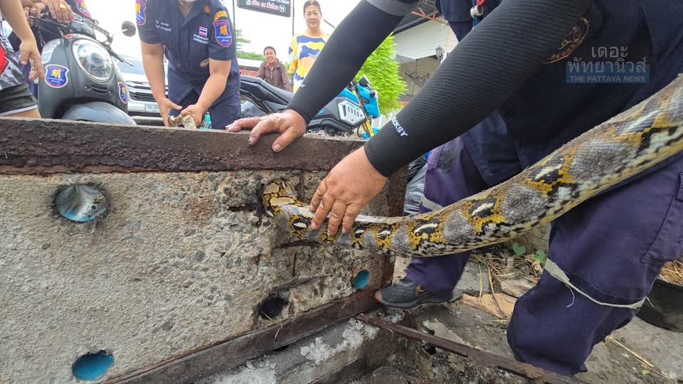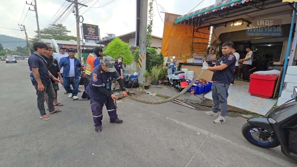 SRI RACHA: Een team van de reddingsdienst Sawaeng Prateep heeft gisteren een python van circa 3 meter bevrijd die vastzat in een afvoerpijp voor een restaurant langs de toegangsweg naar Wat Khao Taeng On in tambon Surasak.