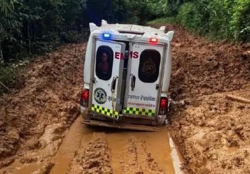 NOORD-THAILAND: In de provincie Tak moest een medisch team 9 uur door de modder worstelen om een vijf maanden oude baby met ademhalingsproblemen te helpen. De medewerkers van het Umphang-ziekenhuis lieten echt zien wat ze waard zijn in deze afgelegen regio.