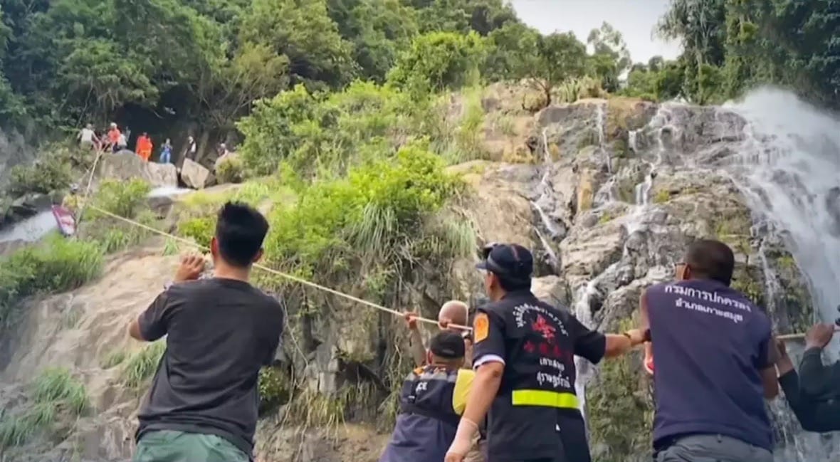 Khun Kritchakorn, wiens taak het is om buitenlandse toeristen noodhulp te bieden, citeerde de vriend van de vrouw die zei dat ze ’s middags naar de top van de waterval geklommen waren.
