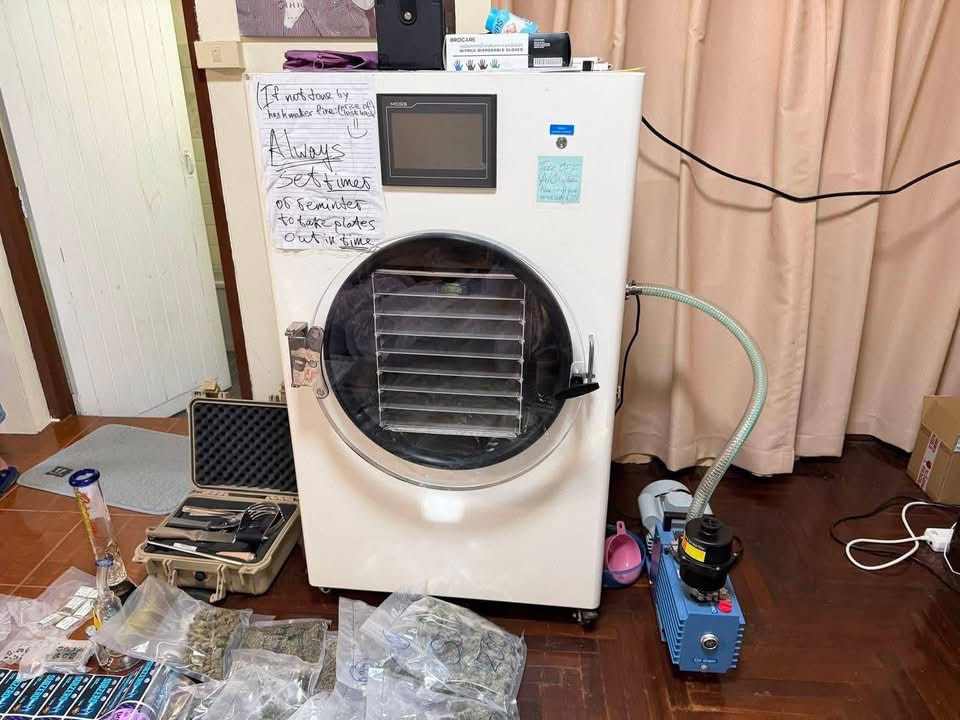 Tijdens de inval kwam er een bonte verzameling aan spullen tevoorschijn: 48 zakken gedroogde cannabis, een droogoven, een vriezer, en maar liefst drie dozen met verpakkingszakjes van het merk YUMMY FROST. Daarnaast vonden ze ook een dertigtal apparaten die bij de verwerking werden gebruikt. Alles werd keurig in beslag genomen als bewijs.