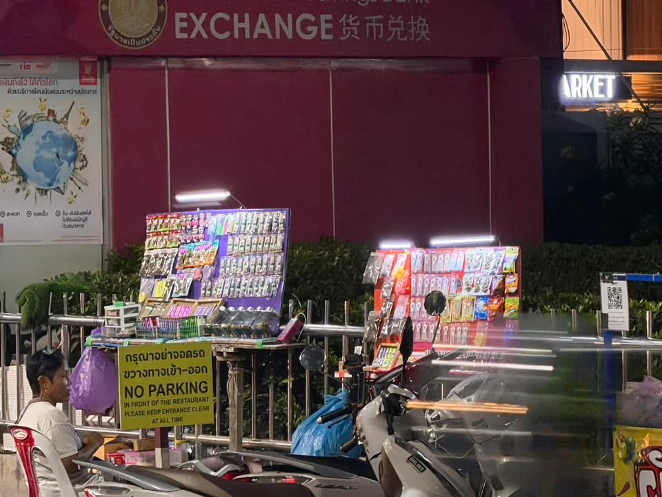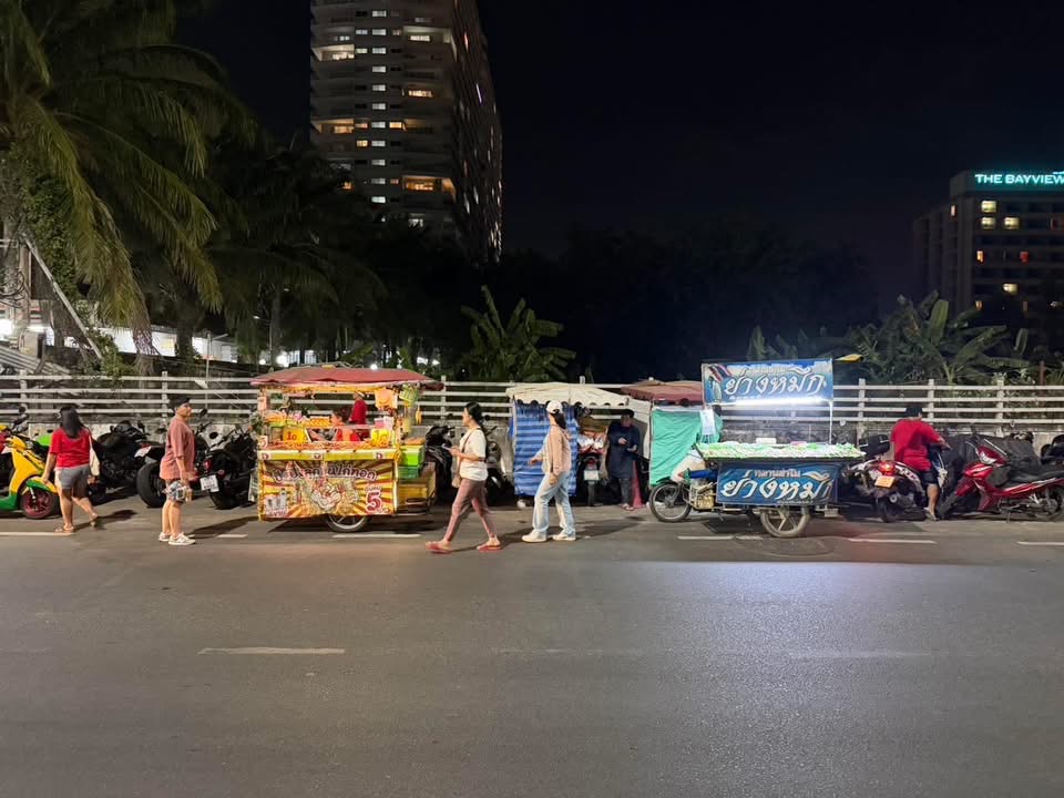 Bij het Central Pattaya Beach winkelcentrum, vlakbij het politiebureau, zagen we een bont gezelschap van zowel Thai als buitenlanders die gezellig samenkwamen om te drinken en te chillen. Lokale verkopers hadden hun campingstoelen opgezet en verkochten vrijuit bier, sterke drank en limonade. En dat is nog niet alles – er waren ook stalletjes met verpakte cannabis en tal van driewielige voertuigen die snacks aanboden!