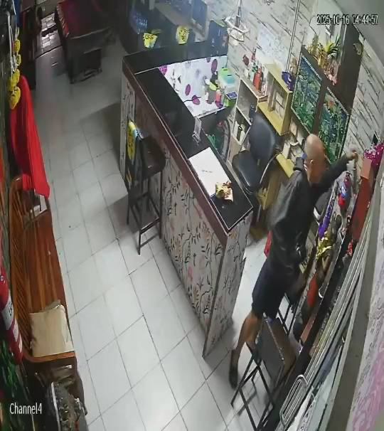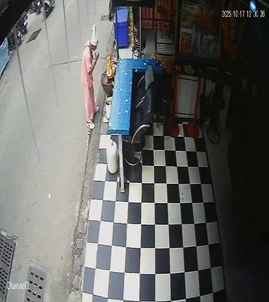 Niet lang daarna zag een andere camera een dakloze man in een roze shirt voor een winkel rondhangen. Hij begon tegen een standbeeld te kletsen en ging vervolgens met een mes in de weer alsof hij in een trance zat. De winkelier haalde snel zijn spullen en visvijver weg.