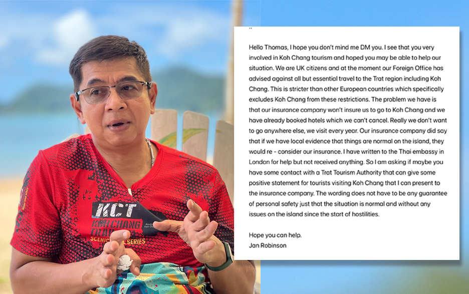 Het probleem kwam aan het licht toen de Britse Jan Robinson het TAT-kantoor in Londen benaderde en uitlegde dat de reisadviezen het moeilijk maken om verzekeringen te krijgen. Korakod Opas van het TAT-kantoor in Trat zei dat het er rustig is, maar dat de staat van beleg toeristen en verzekeraars afschrikt.