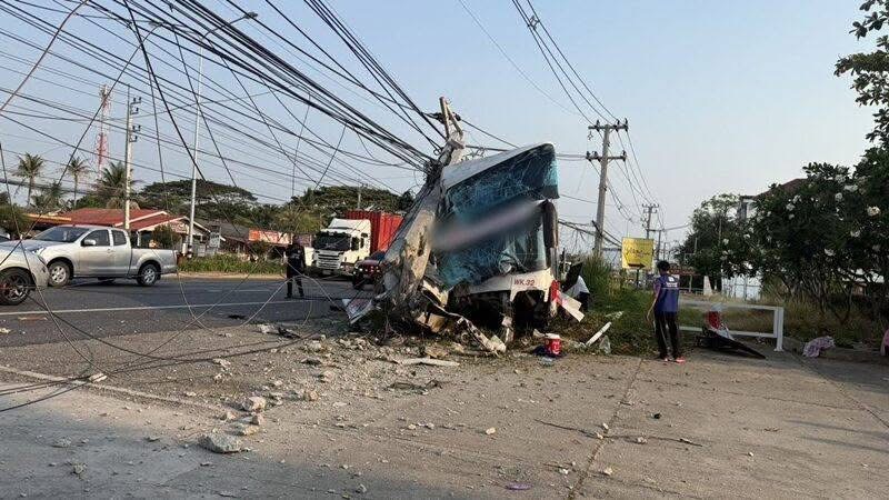 HUA HIN/CHA-AM: Een touringcar met 52 inzittenden raakte deze morgen rond 07.10 uur van de weg en botste tegen twee elektriciteitspalen langs de Phetkasemweg richting zuiden. De bus vervoerde een groep toeristen die een pelgrimstocht langs negen tempels maakten.