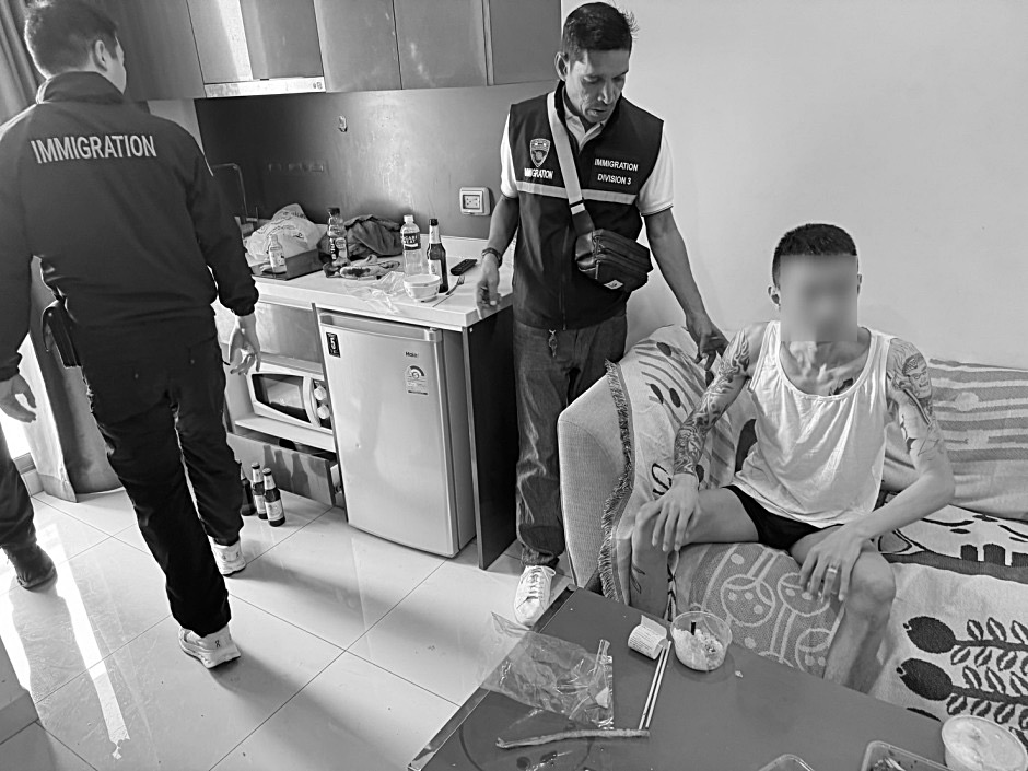 De mannen rijkelijk versierd met tatoeages, veroorzaakten een opschudding in het wooncomplex nadat ze verdacht en bedreigend overkwamen onder invloed van crystal meth (“Yaba Ice”). Doodsbange bewoners waarschuwden op maandag (27 oktober 2025) de immigratiedienst van Chonburi, die de mannen in hun appartement arresteerde.