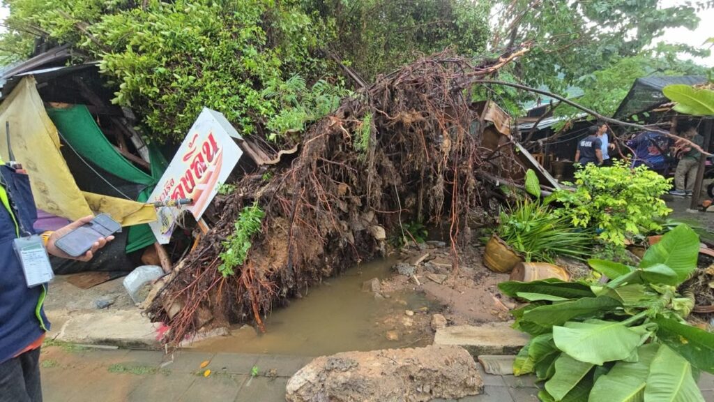 LAEM CHABANG: Rond een uur of één ’s middags belde iemand de reddingsdienst omdat er een enorme boom op een noedeltent was geknald. Het gebeurde vlakbij de populaire noedelshop “Long Lin” aan de weg naar de baai in Tambon Thung Sukla. Tijdens een flinke windvlaag viel een oude boom, die al jaren op dezelfde plek stond, om en crashte dwars door het dak van de shop.